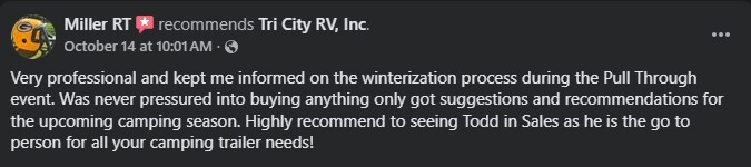 At Tri City RV, our goal is simple: to keep every customer confident, educated, and ready for the road. As a family-owned Michigan RV dealer, we take pride in providing expert guidance, honest service, and long-term care that builds trust year after year.